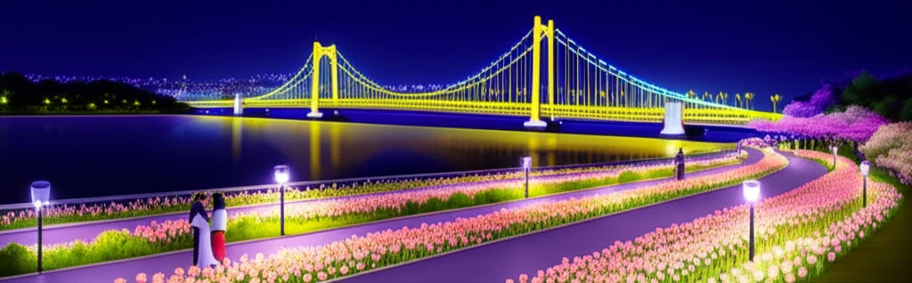 또 다른 낭만 코스로는 서천변 꽃길이 있어요. 3월이면 갓 피어난 매화와 봄꽃들이 형형색색의 야간 조명과 어우러져 환상적인 산책로를 완성한답니다.